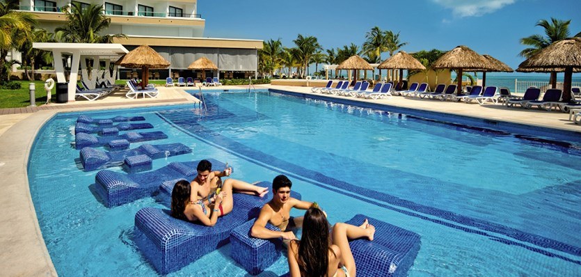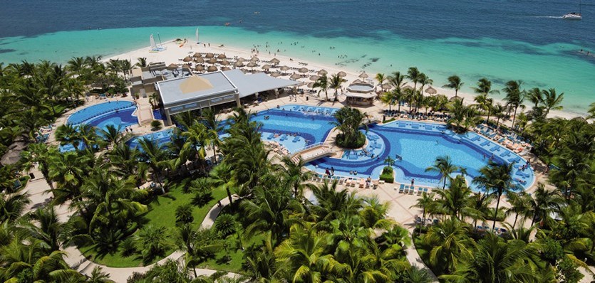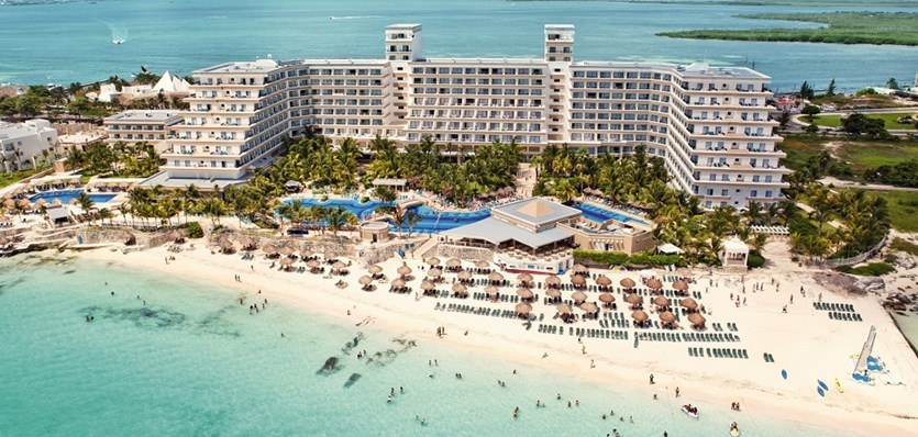 The Hotel Riu Caribe (24h All Inclusive) is located in the hotel area of Cancun, Mexico, in a seafront location on a beach with turquoise water and fine sand.